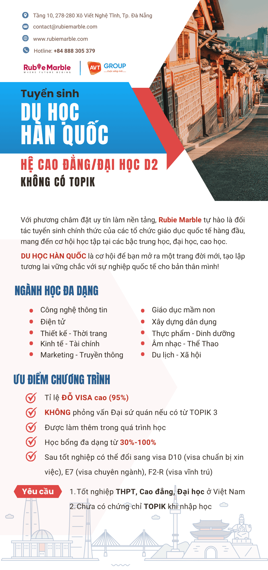 Phù hợp học sinh mới tốt nghiệp hoặc chưa có tiếng Hàn. Học khóa tiếng tại Việt Nam, sau đó sang Hàn học chính khóa với lộ trình chuẩn và visa tỷ lệ cao.